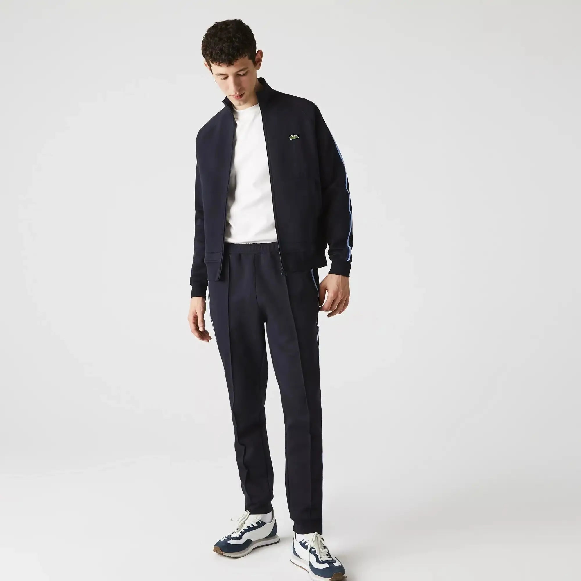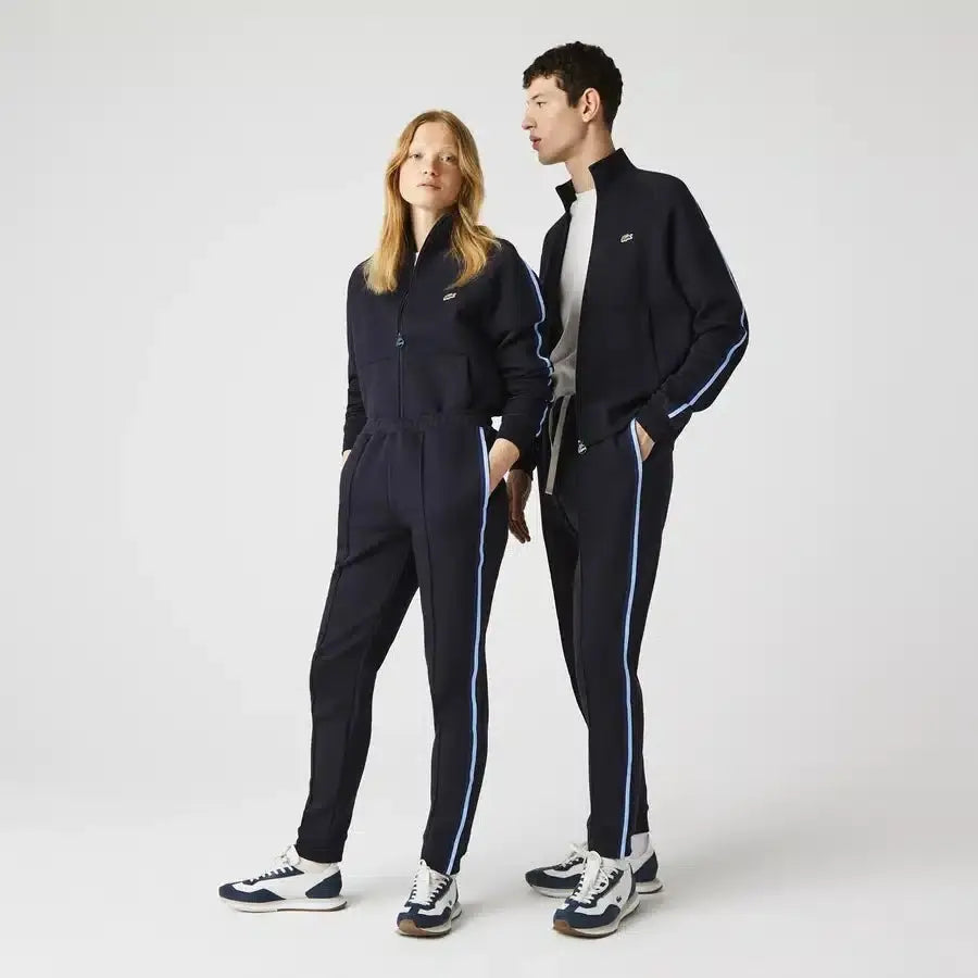 Complete o seu look urbano com este fato de treino unissex. Confeccionada em uma mistura de algodão orgânico, esta peça elegante apresenta cintura ajustável, punhos com zíper, bolsos laterais e faixas contrastantes nas laterais.